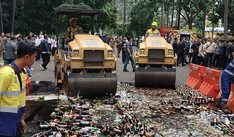 1.128 Botol Miras Hasil Razia Satpol PP Tangerang Dilindas Alat Berat