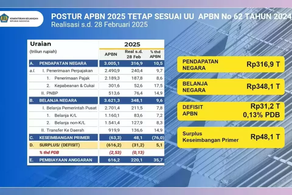"Defisit APBN tahun 2025 ditetapkan sebesar Rp 616,2 triliun. Dengan defisit Rp 31,2 triliun ini, masih dalam batas yang telah ditargetkan, yakni 2,53% terhadap PDB atau setara dengan Rp 616,2 triliun," ujar Sri Mulyani dalam konferensi pers APBN KiTa Edisi Maret 2025 yang berlangsung di Jakarta, Kamis (13/3/2025).