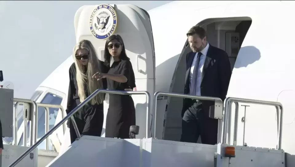 Istri Vance, Usha, turun dari pesawat bersama istri Kirk, Erika. Keduanya mengenakan pakaian hitam dan kacamata hitam, menandai kesedihan yang mendalam. Beberapa langkah di belakang, Vance berjalan dengan setelan jas gelap, mengikuti momen penuh duka itu.