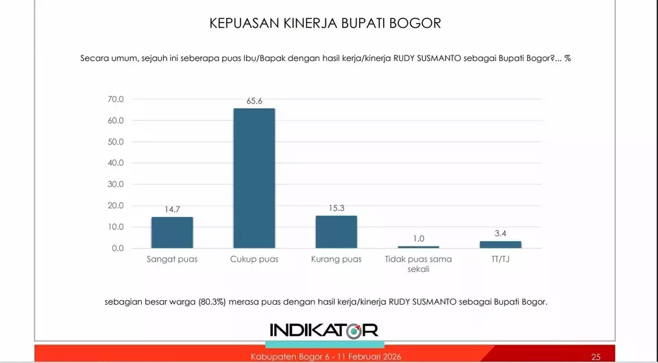 Lembaga survei Indikator merilis hasil evaluasi publik terhadap pencapaian sasaran program Pemerintah Kabupaten (Pemkab) Bogor untuk periode survei 6-11 Februari 2026 tingkat kepuasan (approval rating) masyarakat berada di angka 80,3 persen untuk Bupati Bogor dan Wakil Bupati Bogor diangka 79,3 persen, melampaui ambang batas psikologis diatas 50 persen. Capaian ini menunjukkan bahwa secara umum publik menilai kinerja pemerintahan dalam satu tahun terakhir berjalan relatif baik dan positif.