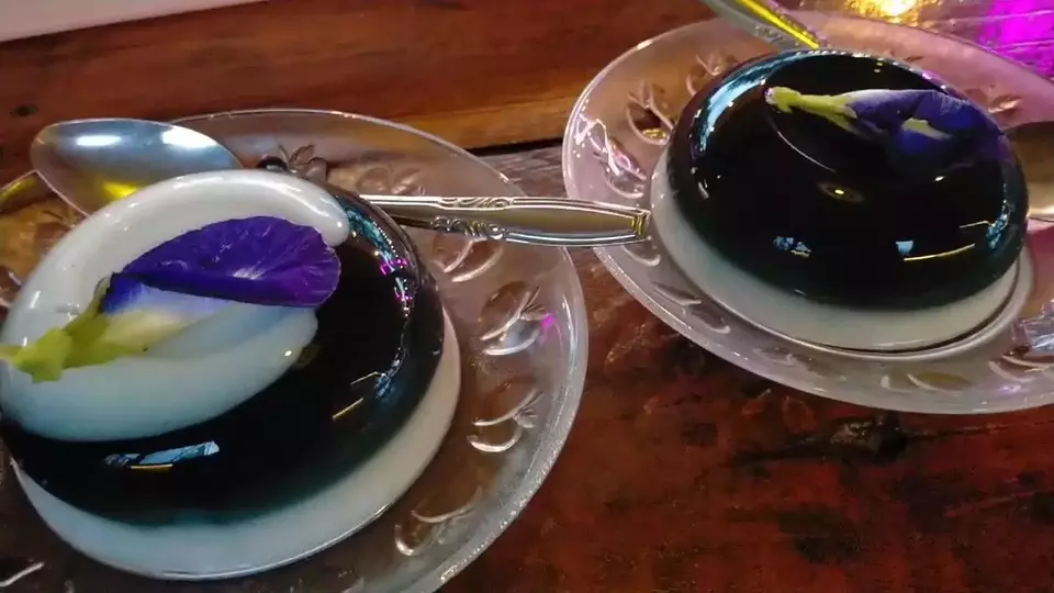 Warung Griyo Dahar Kepenak menghadirkan menu takjil berwarna ungu alami berupa puding dan es bunga telang. Menu tersebut menjadi favorit berbuka puasa selama Ramadan.
