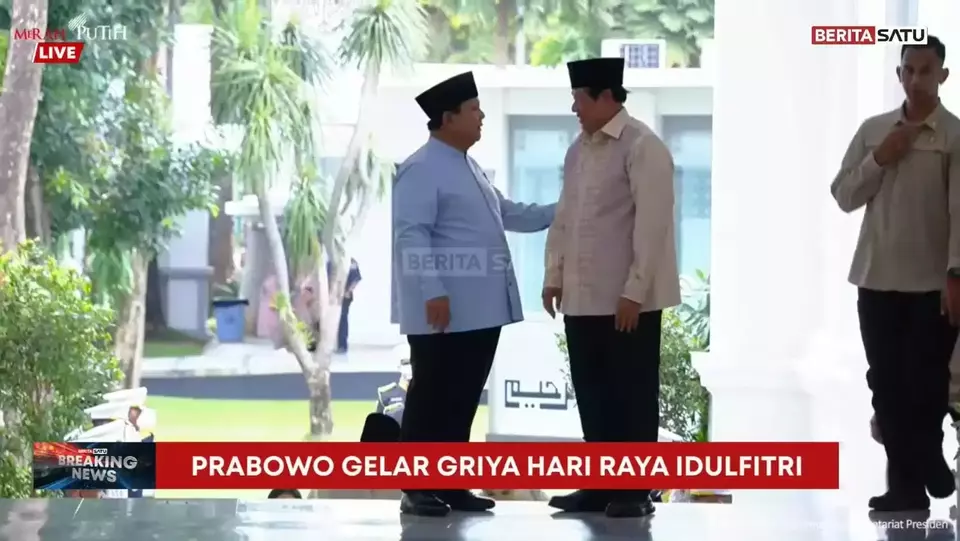 Jakarta, Beritasatu.com - Presiden Prabowo Subianto menerima sejumlah tokoh nasional dan para menteri dalam acara gelar griya atau open house Idulfitri 1447 Hijriah di Istana Merdeka, Jakarta, Sabtu (21/3/2026). Kegiatan tersebut berlangsung hangat dengan dihadiri pejabat negara hingga masyarakat umum.