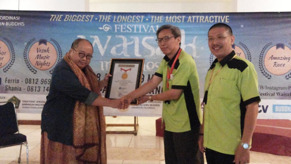 Jakarta- Festival Waisak untuk Indonesia berhasil meraih rekor Museum Rekor Indonesia (MURI) sebagai Festival Waisak untuk Indonesia pertama dan terbesar di dunia.