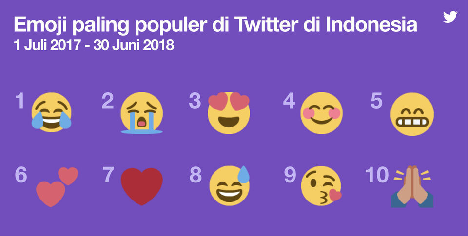 Dengan kata lain, jika misalkan ada dua emoji dalam satu tweet, maka ini akan dihitung menjadi dua emoji. Di dunia, emoji yang paling populer adalah Tears of Joy Smiley atau emoji wajah dengan tangis bahagia. Begitu juga di Indonesia.