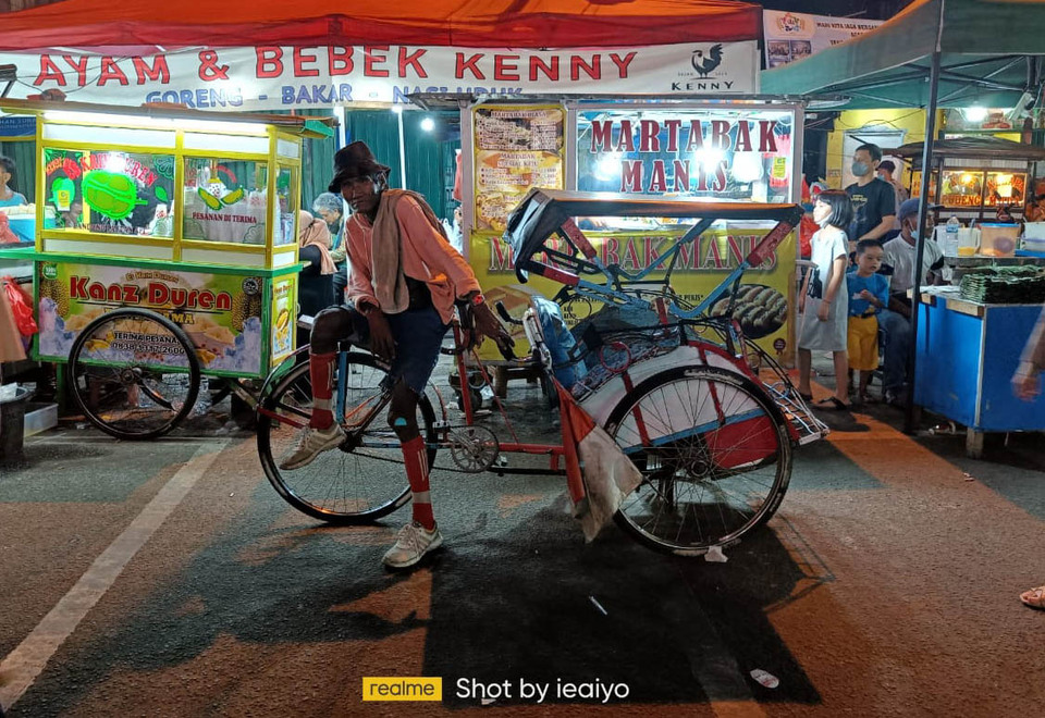 Pasar Lama di Jalan Kisauman, Kabupaten Tangerang, tak pernah sepi menjelang sore hingga tengah malam. Berbagai jajanan dijual, di Jalan yang ditetepakan menjadi kawasan Culinary Night Kota Tangerang pada 2014 silam itu seperti tak mengenal pemberlakuan pembatasan aktivitas manusia terkait penyebaran virus Corona. Selalu ramai.\nMemotret kegiatan malam di pasar yang menyediakan berbagai kuliner itu tentu jadi hal yang mengasyikan. Sayangnya, minimnya pencahayaan saat malam membuat memotret dengan cahaya dan ketajaman yang baik, sulit didapat dengan menggunakan kamera hanphon yang tak terlalu mahal. Untungnya , ada satu hanphone dengan harga tak terlalu mahal namun memiliki kemampuan memotret dengan cahaya minim. Realme 9 Pro+ memiliki sensor kamera flagship dari Sony IMX766 dengan f/1.56 mampu menciptakan kualitas gambar dengan detail dan tajam serta warna yang natural pada foto, walau tanpa bantuan tripod, berkat fitur optical image stabilization (OIS). BeritaSatu Photo/Mohammad Defrizal\n
